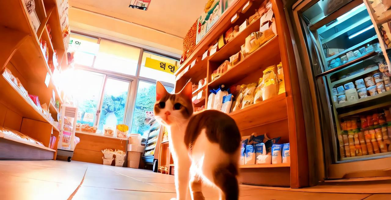 따뜻한 오후, 한국의 작은 동네 슈퍼마켓 내부. 고양이가 입구에서 천천히 걸어 들어오며 주변을 둘러본다. 슈퍼마켓은 나무 선반이 가득 차 있는 아늑한 분위기로, 다양한 상품들이 정돈되어 있다. 부드러운 햇빛이 창문을 통해 들어와 선반 위 상품들에 부드러운 빛을 비춘다. 카메라는 고양이를 따라가며 낮은 앵글에서 천천히 팬(pan)하며 고양이의 시선과 함께 진열대를 살펴본다. 고양이는 눈을 크게 뜨고 꼬리를 살랑거리며 이리저리 돌아다니며 생각에 잠긴 듯한 표정을 짓는다. 조명은 따뜻하고 자연스러우며, 슈퍼마켓 내부의 조용한 배경음이 고양이의 발걸음 소리와 함께 어우러진다. 고양이가 한 선반 앞에서 멈춰 서서 발로 턱을 긁적이며 어떤 물건을 살지 고민하는 모습이 클로즈업으로 잡힌다.