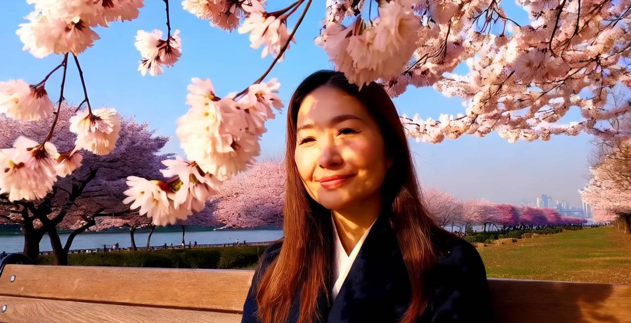 맑은 봄날, 벚꽃이 흐드러지게 핀 공원에서 한국 여인이 벤치에 앉아 있다. 그녀는 긴 머리를 바람에 살짝 날리며 미소 짓고 있다. 주변에는 연분홍빛 벚꽃이 바람에 흩날려 마치 꽃비가 내리는 듯한 장관을 이루고 있다. 배경에는 푸른 하늘과 함께 멀리 보이는 한강이 잔잔하게 흐르고 있다. 조명은 자연광으로, 따뜻하고 부드러운 햇살이 여인의 얼굴을 환하게 비춘다. 카메라는 여인의 얼굴을 클로즈업으로 잡은 후, 천천히 줌아웃하여 주변의 벚꽃과 공원의 전경을 담아낸다. 카메라 움직임은 부드럽고 자연스럽게, 마치 관객이 그 장면 속에 있는 듯한 느낌을 준다.