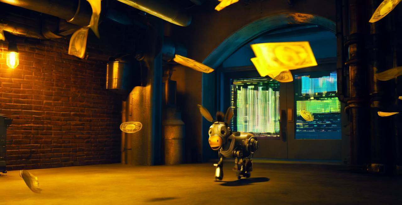 지하에서 탈출하는 귀여운 로봇 당나귀, 주변에 코인, 돈, 주식 표식이 같이 날아 다님