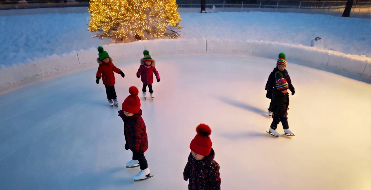눈이 소복이 쌓인 공원 스케이트장에서 한국인 아이들이 즐겁게 스케이트를 타고 있는 장면. 배경에는 화려하게 장식된 크리스마스 트리가 있고, 부드러운 황금빛 조명이 트리를 감싸고 있다. 주변에는 눈 덮인 나무들이 줄지어 서 있으며, 하늘에서는 가끔씩 눈송이가 천천히 떨어진다. 아이들은 두꺼운 겨울 옷을 입고, 빨간색과 초록색의 따뜻한 모자를 쓰고 있다. 카메라는 아이들 사이를 부드럽게 이동하며, 가까운 거리에서 그들의 웃는 얼굴을 클로즈업으로 잡아낸다. 카메라가 회전하며 아이들이 손을 맞잡고 원을 그리며 스케이트를 타는 모습을 담아낸다. 주변의 조명은 따뜻하고 아늑한 분위기를 조성하며, 아이들의 웃음소리가 배경 음악처럼 들린다.