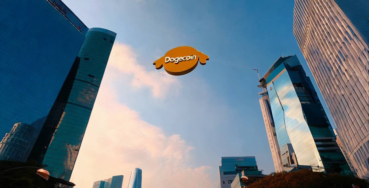 화창한 날씨의 서울 도심을 배경으로, 높은 빌딩들이 즐비한 거리 위로 도지코인의 로고가 떠오르는 장면. 빌딩 유리창에 반사되는 햇빛이 반짝이며 도지코인의 로고가 점점 커지며 하늘을 향해 상승한다. 로고 주변으로는 가벼운 구름이 지나가며, 하늘은 맑고 푸르다. 카메라는 아래에서 위로 천천히 팬하며 도지코인의 상승을 강조한다. 조명은 자연광으로 밝고 생동감 있게 표현되며, 전체적인 분위기는 희망적이고 긍정적이다.