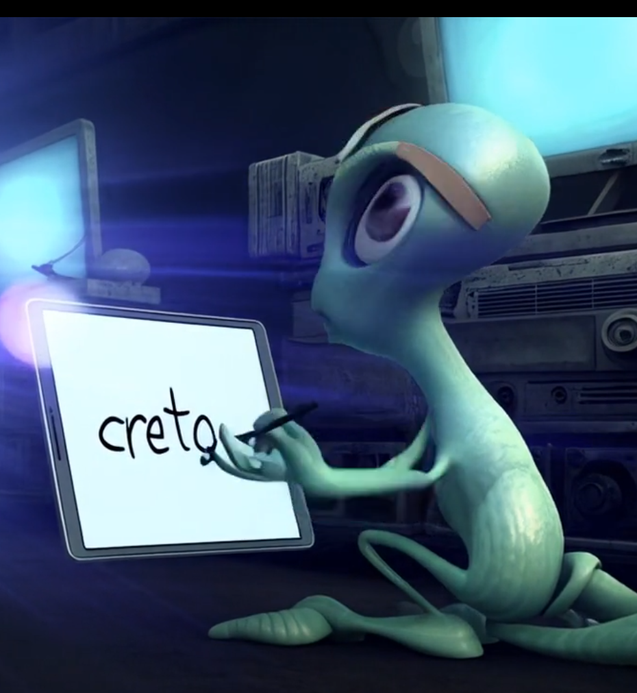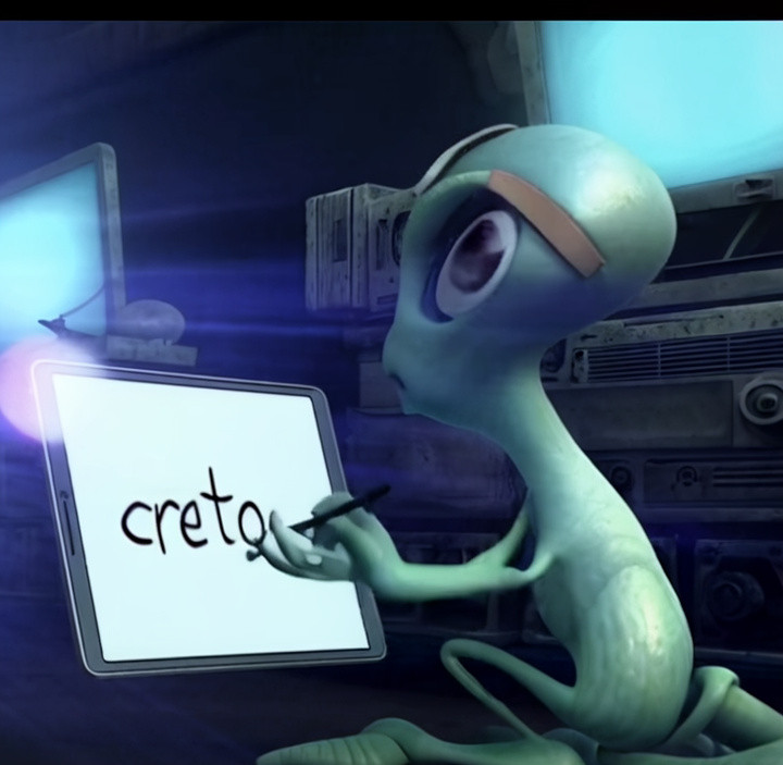 어두운 공장 내부, 차가운 푸른빛 조명이 어둡게 설정된 공간에서 여러 컴퓨터가 켜져 있다. 컴퓨터 화면에서 나오는 빛이 주변을 은은하게 비추며, 배경에는 희미한 기계 소리가 들리고 곳곳에 금속성의 반사광이 보인다. 카메라는 넓은 샷으로 시작하여 여러 크리에이터들이 컴퓨터 앞에서 작업하는 모습을 담는다. 카메라는 점점 줌인하여 헤드셋을 끼고 리듬을 타며 아이패드를 보고 있는 외계인의 뒷모습을 포착한다. 외계인의 피부는 녹색빛을 띠며 부드러운 광택이 있다. 카메라는 부드럽게 외계인의 뒷모습에 클로즈업하며 아이패드 화면으로 포커스를 이동한다. 아이패드 화면에는 외계인이 손가락으로 "creto"라는 글씨를 쓰는 모습이 선명하게 보인다. 이 장면은 부드러운 팬 샷으로 마무리되어 외계인의 손끝 움직임을 강조한다.