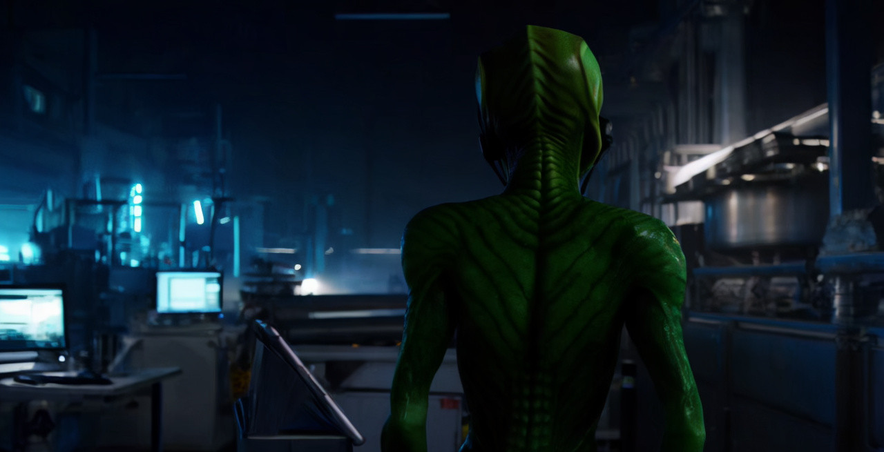 어두운 공장 내부, 여러 컴퓨터가 켜져 있는 장면. 공장의 조명은 차가운 푸른빛으로 어둡게 설정되어 있으며, 컴퓨터 화면에서 나오는 빛이 주변을 은은하게 비춘다. 배경에는 기계 여러 크리에이터들이 컴퓨터 앞에소리가 희미하게 들리며, 곳곳에 금속성의 반사광이 보인다. 카메라는 넓은 샷으로 시작해 헤드셋을 끼고 리듬을 타며 아이패드를 보고 있는 외계인의 뒷모습을 담는다. 외계인의 피부는 녹색빛을 띠며, 부드러운 광택이 있다. 카메라는 부드럽게 외계인의 뒷모습에 클로즈업하며, 아이패드 화면으로 포커스를 이동한다. 아이패드 화면에는 외계인이 손가락으로 "creto"라는 글씨를 쓰는 모습이 선명하게 보인다. 이 장면은 부드러운 팬 샷으로 마무리되어 외계인의 손끝 움직임을 강조한다.