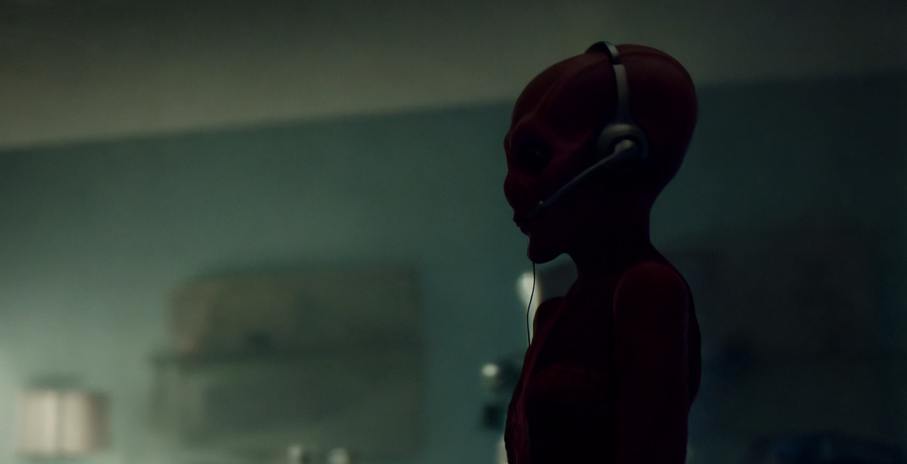 어두운 방 안, 부드럽고 은은한 조명이 방 안을 감싸고 있다. 배경은 어둠 속에서 약간 흐릿하게 보이는 벽과 가구들이며, 방 안의 전체적인 분위기는 차분하고 집중된 느낌을 준다. 카메라는 귀여운 외계인의 뒷모습을 클로즈업하여, 외계인이 헤드셋을 쓰고 리듬에 맞춰 살짝 고개를 끄덕이는 장면을 포착한다. 외계인의 피부는 매끄럽고 독특한 색조를 띠고 있으며, 한국인처럼 보이는 체형을 가지고 있다. 외계인이 들고 있는 아이패드 화면에 초점을 맞추면서, 외계인의 손이 부드럽게 움직이며 'creto'라는 단어를 손글씨로 쓰는 모습을 보여준다. 카메라는 천천히 줌 인하여 아이패드 화면에 집중하고, 외계인의 손글씨가 점점 더 뚜렷하게 보이도록 한다. 조명의 반사로 인해 아이패드 화면이 약간 빛나며, 외계인의 손글씨가 화면에 선명하게 나타난다.