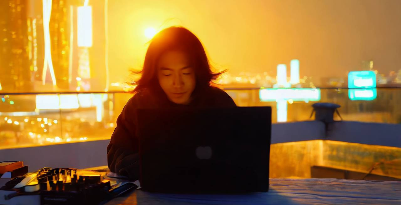 도시의 고층 빌딩 옥상에서 한국인 크리에이터가 노트북 앞에 앉아 작업하는 장면. 주변에는 반짝이는 네온사인과 바쁜 도로의 불빛들이 어우러져 있다. 저녁 시간대의 부드러운 황금빛 조명이 크리에이터의 얼굴을 은은하게 비추고, 바람에 흩날리는 머리카락이 역동성을 더한다. 카메라는 크리에이터의 집중된 표정을 클로즈업으로 잡다가, 점차 줌아웃하여 도시의 전경과 함께 크리에이터의 작업 공간을 보여준다. 배경에는 희미하게 들리는 음악 소리가 들리고, 크리에이터의 손이 키보드를 빠르게 움직이며 창의적인 작업을 하는 모습이 강조된다. 카메라는 좌우로 천천히 움직이며 그의 노력이 담긴 공간을 다양한 각도에서 포착하고, 마지막에는 크리에이터의 얼굴에 미소가 번지는 순간을 담아낸다.