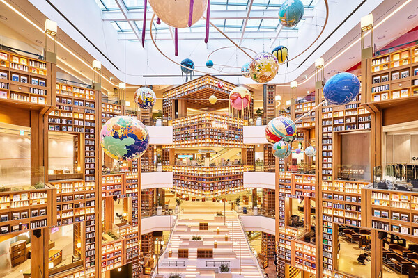스타필드라는 쇼핑몰에 쇼핑몰만큼 큰 풍선이 스타필드를 정복하러 다가오는 모습