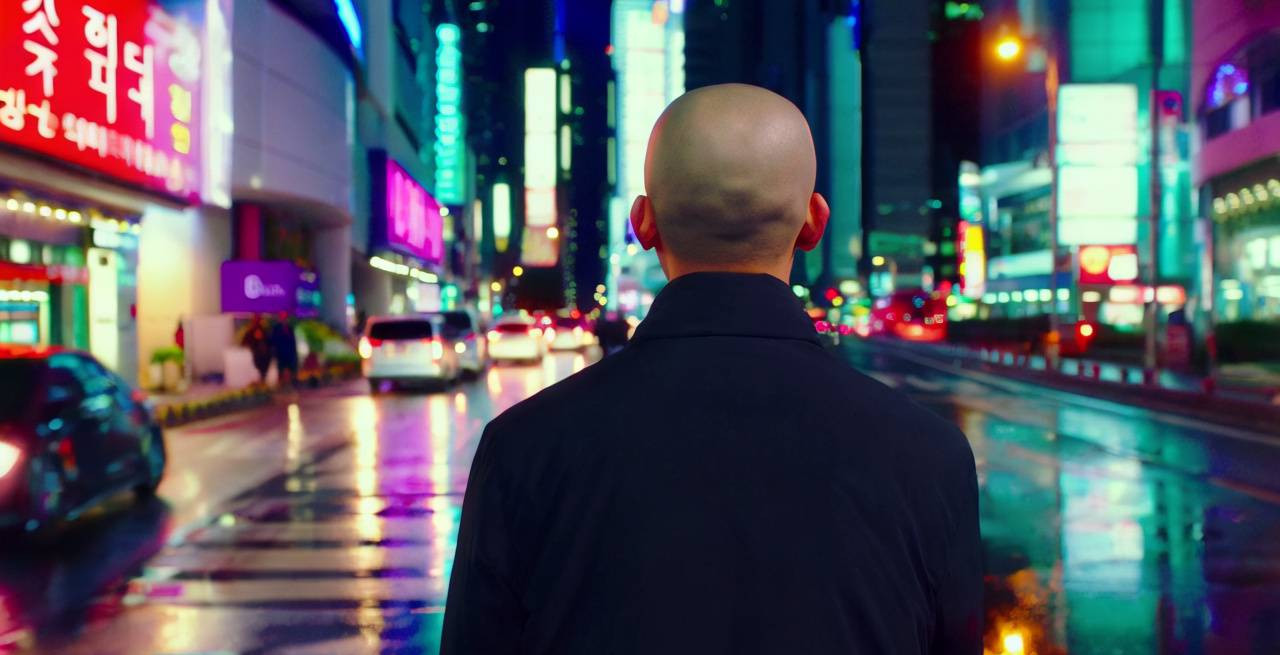도심의 바쁜 거리, 한 한국인 남성이 뒷모습을 보이며 서 있다. 그의 머리는 반짝이는 조명 아래에서 대머리처럼 보인다. 카메라는 남성의 뒷모습을 클로즈업으로 잡고 있으며, 부드럽게 회전하여 그의 머리 주위를 천천히 돌아간다. 주변에는 고층 빌딩의 불빛이 반짝이고, 거리의 네온사인이 화려하게 빛나며, 지나가는 자동차의 헤드라이트가 장면을 더욱 생동감 있게 만든다. 카메라가 남성의 머리 주위를 완전히 돌아가자, 그의 머리는 사실 햄버거 모양으로 드러난다. 햄버거의 빵과 패티, 그리고 야채들이 선명하게 보이며, 주변의 조명이 이를 더욱 강조한다. 전체적인 분위기는 약간의 유머와 놀라움을 자아내며, 카메라는 남성의 얼굴을 비추며 그의 놀란 표정을 포착하고, 그 순간을 슬로우 모션으로 연출하여 장면을 마무리한다.