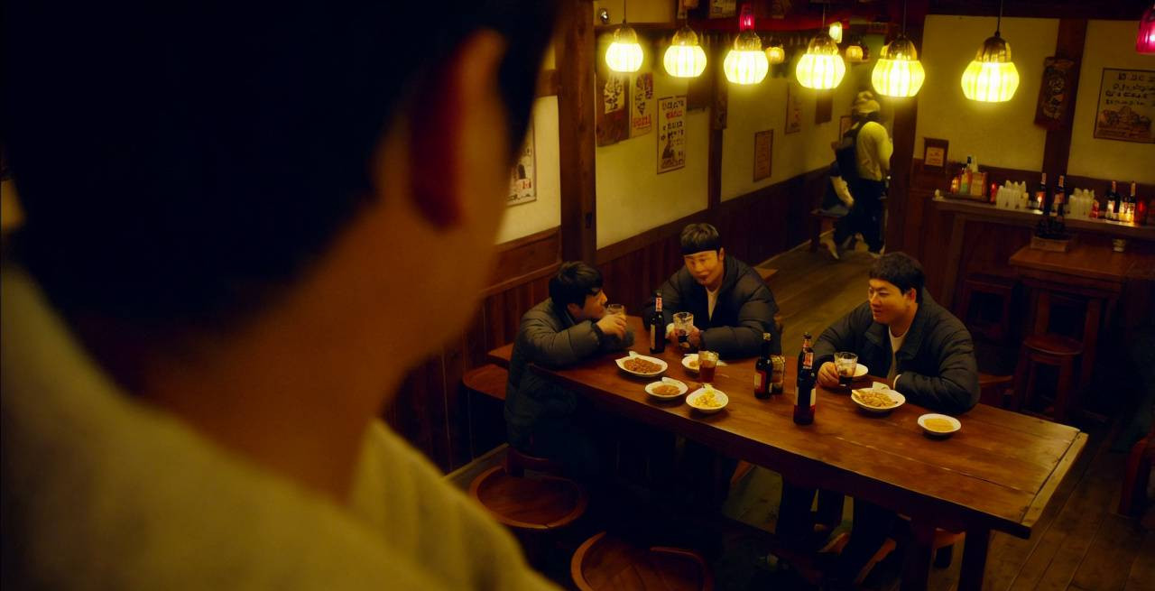 늦은 저녁, 한국 배경의 술집에서 뒷모습의 세 명의 남자들이 술을 마시며 이야기중이다