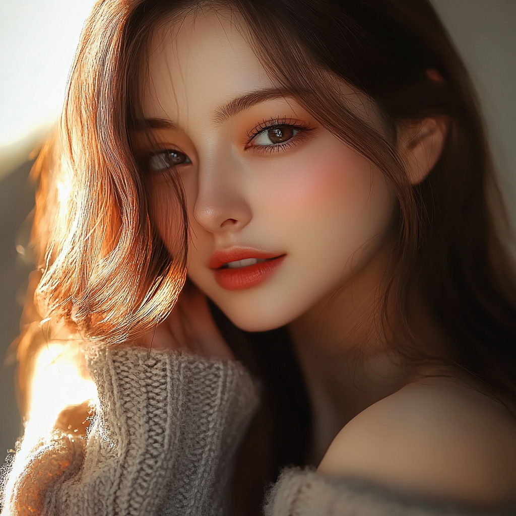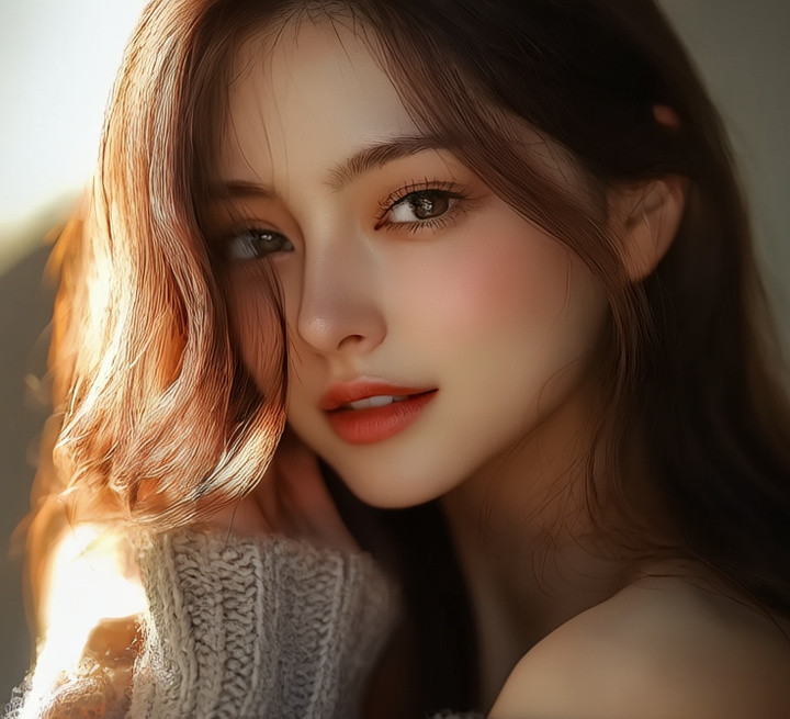 사진속의 여성이 따듯한 조명 속에서 치아를 많이 보이지 않은채 슬며시 따듯하게 아름답게 미소지으며 정면을 바라보고 있다.