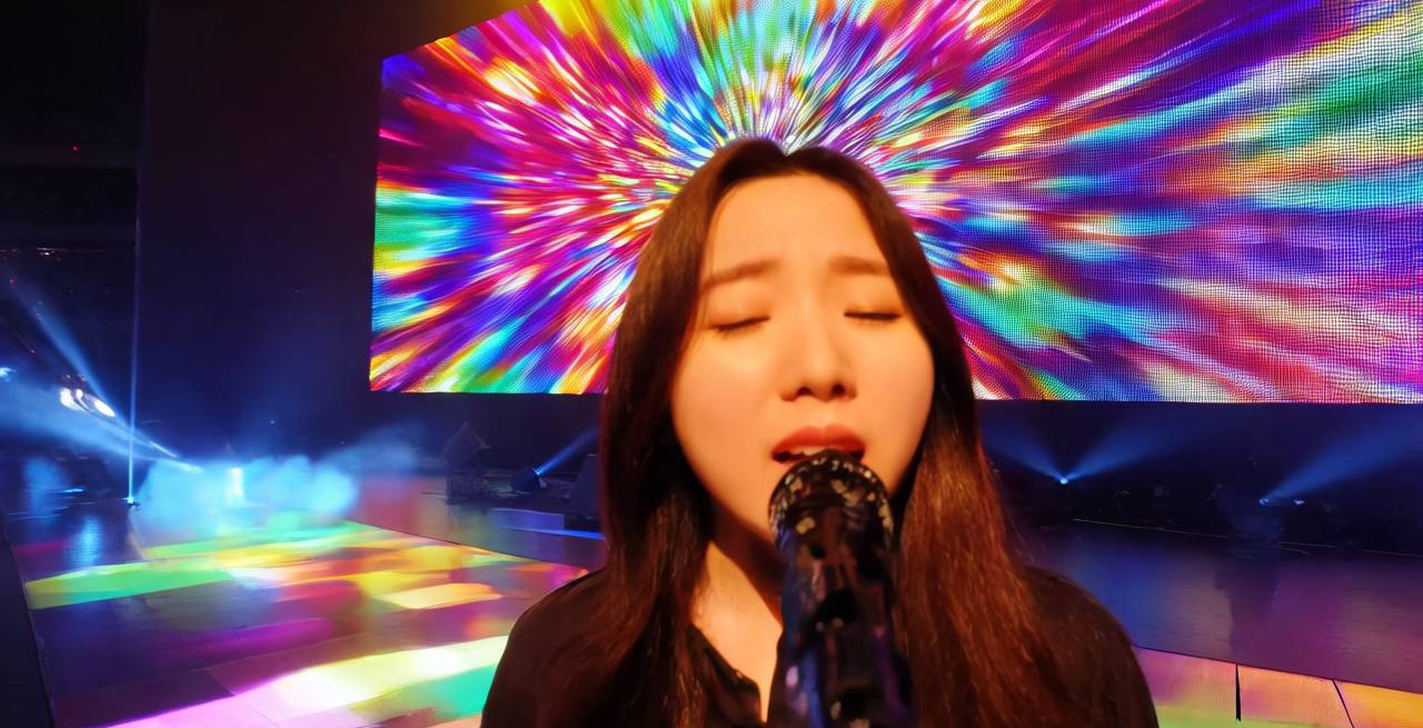 한국인 여성 가수가 무대 위에서 노래를 부르는 장면을 묘사. 배경은 화려한 조명으로 가득한 콘서트 무대, 무대 뒤에는 LED 스크린이 다양한 색상의 추상 패턴을 보여주고 있음. 주변 환경은 관중들이 가득 찬 콘서트 홀, 관중들은 흥분된 표정으로 가수를 응원하고 있음. 조명은 다채로운 스포트라이트가 가수를 비추고 있으며, 무대 위에는 약간의 안개 효과가 더해져 신비로운 분위기를 연출. 카메라는 가수의 얼굴을 클로즈업으로 잡고 있다가, 서서히 줌아웃하여 무대 전체와 관중의 모습을 보여줌. 카메라 움직임은 부드럽게 팬하여 가수의 동작을 따라가며, 가수의 감정이 잘 드러나도록 안정적인 앵글을 유지. 분위기는 감동적이고 열정적인 느낌, 가수의 목소리가 무대와 관중을 가득 채우고 있음.