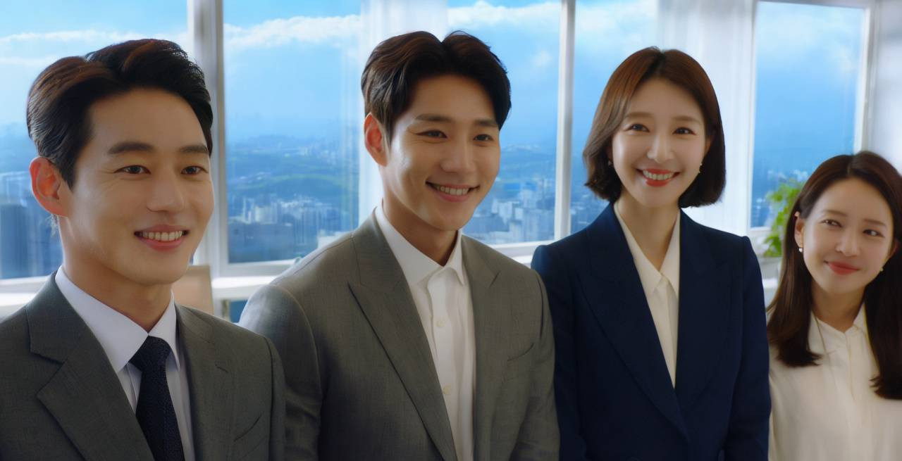정장을 입은 남자2명 정장을 입은 여자2명 한국 사람이다. 단정하고 깔끔한 용모에 다 같이 나란히 서서 웃고 있다. 배경은 회사이고 이들의 나이는 다양하게 20대부터 40대까지이다