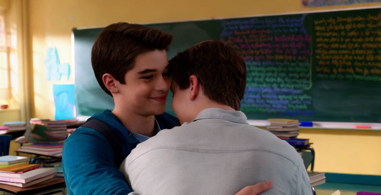 짧은 동영상 장면: 교실 안에서 남자 학생과 남자 청년 선생님이 서로를 따뜻하게 안아주며 화목한 분위기를 만들어내는 장면. 배경과 주변 환경: 교실의 벽은 밝은 색으로 칠해져 있으며, 칠판에는 다양한 색상의 마커로 그려진 그림과 글씨가 보인다. 창문을 통해 들어오는 자연광이 교실을 환하게 비추고 있으며, 책상 위에는 교과서와 학용품이 정돈되어 있다. 교실 한쪽에는 학생들이 만든 작품들이 벽에 걸려 있어 따뜻한 분위기를 더한다. 조명과 분위기: 부드러운 자연광이 교실을 채우고 있어 아늑하고 따뜻한 느낌을 준다. 조명은 부드럽고 따뜻한 톤으로, 학생들과 선생님이 서로를 바라보며 웃는 모습이 잘 드러난다. 전체적인 분위기는 화목하고 친근하며, 서로에 대한 신뢰와 유대감이 느껴진다. 카메라 샷의 종류와 움직임: 카메라는 중간 거리에서 시작해 두 사람의 얼굴을 클로즈업으로 잡아주며 따뜻한 미소를 강조한다. 이후 카메라는 천천히 뒤로 물러나면서 두 사람의 전체 모습을 포착하고, 교실의 밝고 화목한 분위기를 강조한다. 마지막에는 카메라가 살짝 흔들리며 두 사람의 따뜻한 포옹을 부각시키며 장면을 마무리한다.