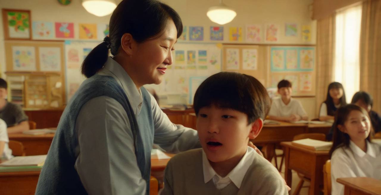 교실 내부, 따뜻한 조명이 비추는 공간. 벽에는 다양한 교육 자료와 학생들이 만든 작품들이 걸려 있다. 중앙에는 나무 책상이 놓여 있고, 그 주위에는 여러 개의 의자가 배치되어 있다. 카메라는 학생과 선생님을 중심으로 클로즈업 샷을 잡고, 선생님이 한국 남학생을 부드럽게 안아주며 미소 짓는 장면을 포착한다. 선생님의 모습은 따뜻하고 친근하며, 학생은 놀라움과 기쁨이 섞인 표정을 짓고 있다. 배경에는 다른 학생들이 호기심 어린 표정으로 이 장면을 지켜보고 있으며, 교실의 분위기는 화목하고 즐거운 느낌이 가득하다. 카메라는 천천히 줌 아웃하면서 교실 전체를 보여주고, 학생들이 서로 대화하며 웃고 있는 모습이 담긴다. 마지막에는 교실의 전경을 보여주며, 학생들과 선생님이 함께하는 따뜻한 순간을 강조한다.