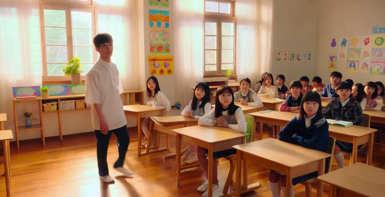 짧은 동영상 장면: 남자 한국 학생이 남자 한국 청년 선생님에게 안겨 반 분위기가 산뜻해지는 모습 장면 설명: 교실 내부, 따뜻한 햇빛이 창문을 통해 들어오며, 바닥은 나무로 되어 있고 벽에는 학생들이 그린 그림들이 붙어 있다. 교실의 중앙에는 여러 개의 책상이 배열되어 있고, 학생들이 앉아 있는 모습이 보인다. 학생들은 다양한 표정으로 선생님을 바라보며 즐거운 분위기를 느끼고 있다. 조명과 분위기: 자연광이 교실을 부드럽게 비추고 있어 따뜻하고 포근한 느낌을 주며, 학생들의 얼굴에 생기가 돌고 있다. 전체적인 분위기는 화기애애하고 즐거운 느낌이 강조된다. 카메라 샷: 카메라는 학생과 선생님을 중심으로 한 중간 거리에서 시작하여, 학생이 선생님에게 안기는 순간을 클로즈업으로 포착한다. 카메라가 살짝 흔들리며 학생의 표정과 선생님의 반응을 세밀하게 담아낸다. 이후, 카메라는 천천히 줌 아웃하여 교실 전체의 분위기를 보여주며, 학생들과 선생님 간의 따뜻한 교감을 강조한다. 이 장면은 학생과 선생님 간의 유대감을 통해 교실의 긍정적인 에너지를 전달하며, 짧은 시간 안에 따뜻한 감정을 느낄 수 있도록 구성된다.