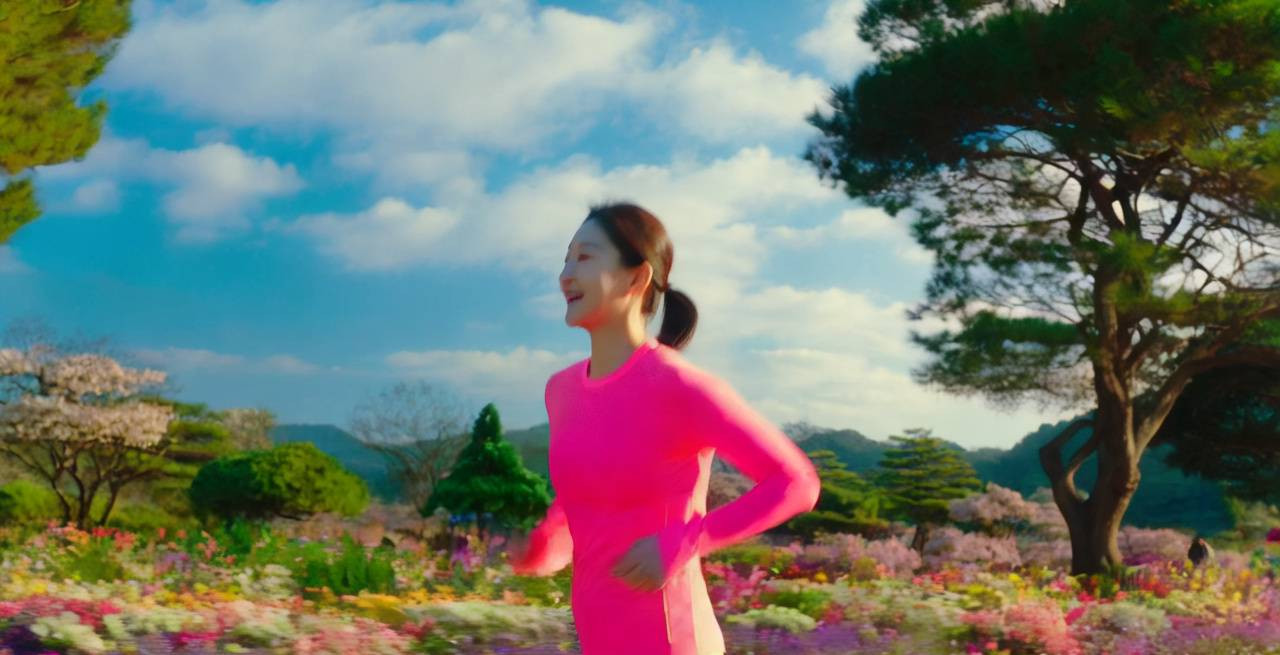 한 여성이 조깅을 하고 있는 장면을 담은 짧은 동영상. 배경은 푸른 하늘과 흰 구름이 떠 있는 공원으로, 주변에는 울창한 나무와 꽃들이 만발해 있는 풍경이 펼쳐져 있다. 조깅하는 여성은 한국인으로, 경쾌한 운동복을 입고 있으며, 머리는 묶어져 있다. 조명은 자연광으로, 햇살이 부드럽게 비추어 여성의 얼굴과 운동복에 반사되어 따뜻한 느낌을 준다. 분위기는 상쾌하고 활기차며, 여성의 표정은 즐거움과 집중이 어우러져 있다. 카메라는 여성의 측면에서 시작하여, 그녀가 조깅하는 모습을 따라가는 샷으로 설정된다. 카메라가 부드럽게 이동하며 여성의 발이 땅을 딛는 모습과 팔의 움직임을 클로즈업으로 포착한다. 마지막에는 카메라가 천천히 뒤로 물러나며 여성의 전체적인 실루엣과 아름다운 공원 풍경을 함께 담아내는 앵글로 전환된다.