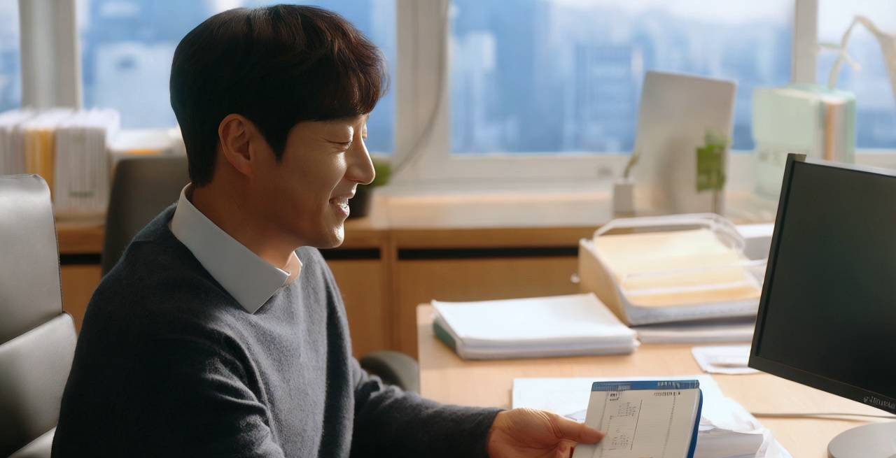 은행 입출금 통장을 바라보면서 기뻐하는 40대 한국 남자 양복을 입고 있으며 사무실 의자에 앉아있다