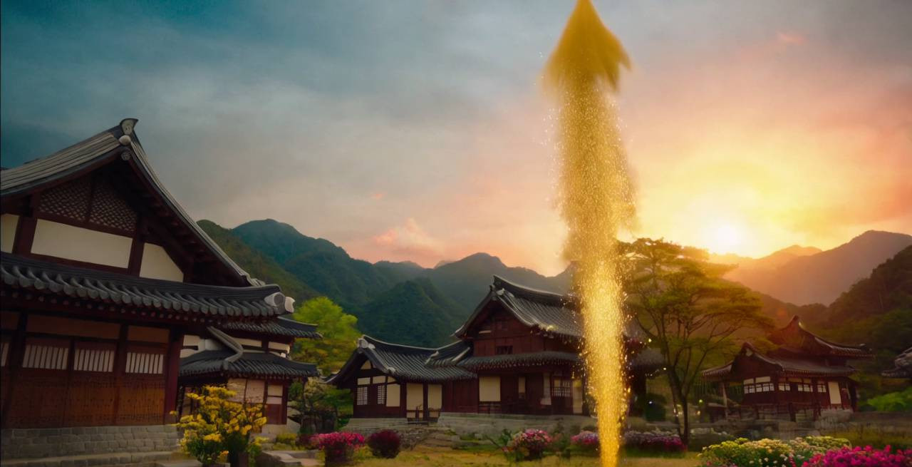 고요한 마을의 저녁, 부드러운 황금빛 햇살이 하늘에서 내려오고 있다. 마을의 전경은 평화로운 분위기로 가득 차 있으며, 아기자기한 집들이 나무와 꽃들 사이에 자리 잡고 있다. 카메라는 낮은 앵글에서 시작하여, 마을의 중앙 마법의 가루가 공중에서 부드럽게 내리며, 금빛 반짝임이 마을 전체를 감싸고 있다. 이 가루는 공중에서 빛나며, 바람에 실려 사람들의 머리 위로 흩날린다. 조명은 따뜻하고 부드러운 느낌으로, 황금색과 오렌지색이 조화를 이루며 마을을 감싸고 있다. 카메라는 갑자기 줌 인하여 한 한국인 남성이 가루를 손으로 잡으며 웃고 있는 모습을 클로즈업한다. 그의 얼굴에는 행복한 미소가 가득하고, 주변 사람들도 함께 웃으며 즐거운 분위기를 만들어낸다. 이 장면은 마법의 가루가 마을에 가져다주는 행복과 황금빛 변화를 상징적으로 보여준다.
