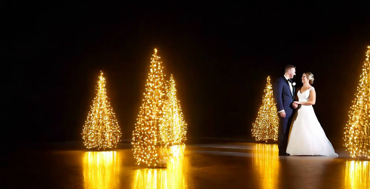 검정색 배경이 깔린 공간에서 고요한 분위기가 감돌고 있다. 황금빛 조명이 부드럽게 비추며, 신랑과 신부의 뒷모습을 환하게 밝혀준다. 신랑은 세련된 턱시도를 입고 있으며, 신부는 화려한 웨딩드레스를 착용하고 있다. 두 사람은 손을 맞잡고 서로의 존재를 느끼며, 조명이 반짝이는 황금빛으로 둘러싸여 있다. 카메라는 중간 거리에서 시작하여 서서히 줌 인하며 두 사람의 실루엣을 강조한다. 조명은 부드럽고 따뜻한 느낌을 주어, 로맨틱한 분위기를 연출한다. 배경은 완전히 검정색으로, 두 사람의 모습이 더욱 돋보이게 한다. 조용한 음악이 흐르며, 이 순간의 특별함을 더욱 깊게 느끼게 한다.