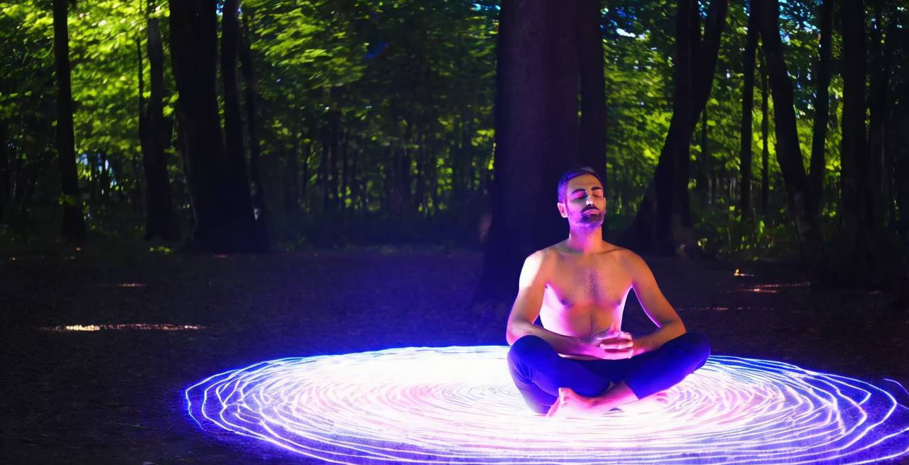 밝은 숲속에 앉아 명상하는 남자, 배 아래에는 빛이 나고 주위에는 빛들이 돌아 다니는 그림