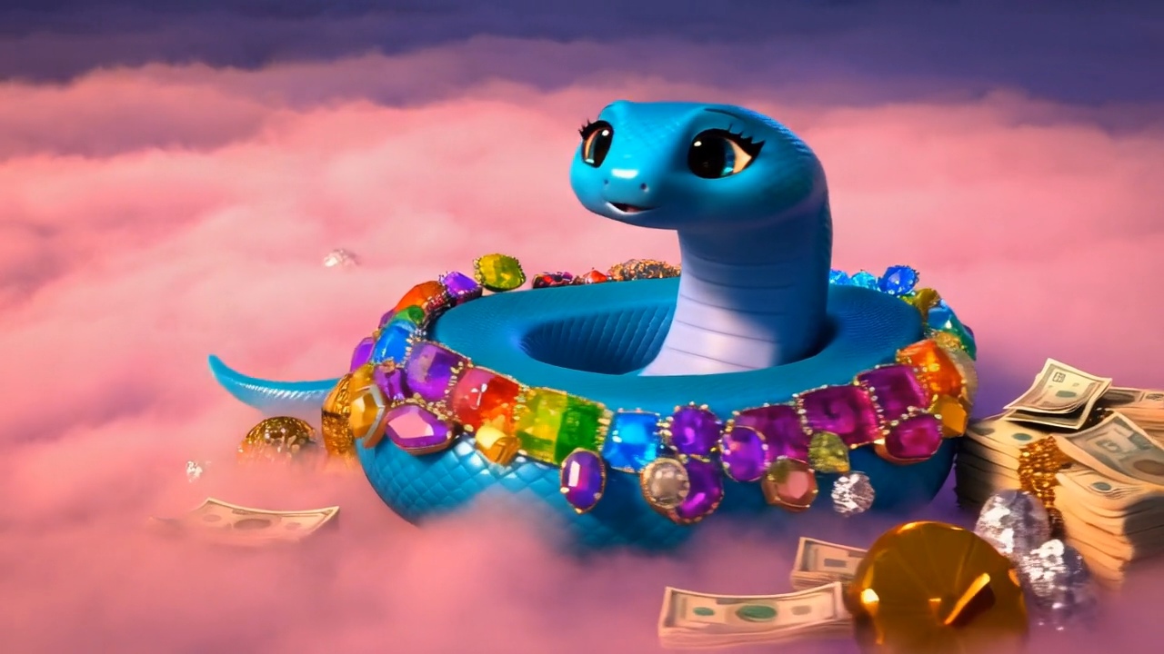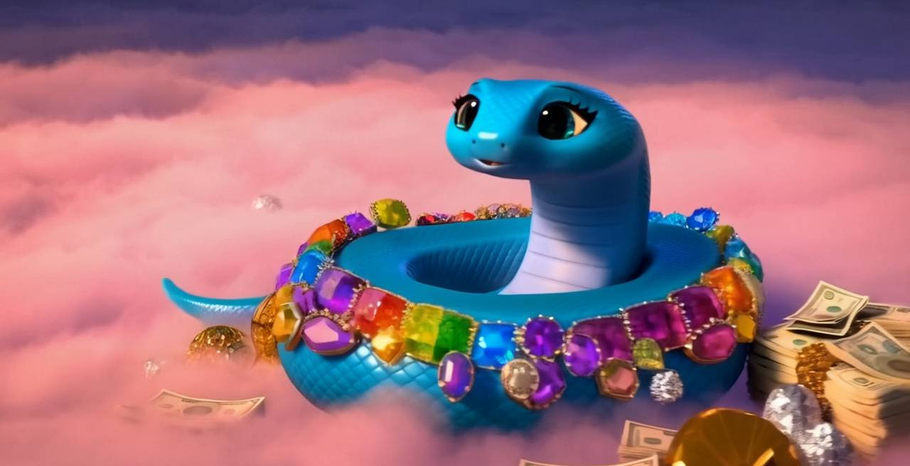 뱀 주위에 배경가득 돈이 쌓여있고 보석들도 가득 쌓여있고 큰 금고도 놓여져있다.