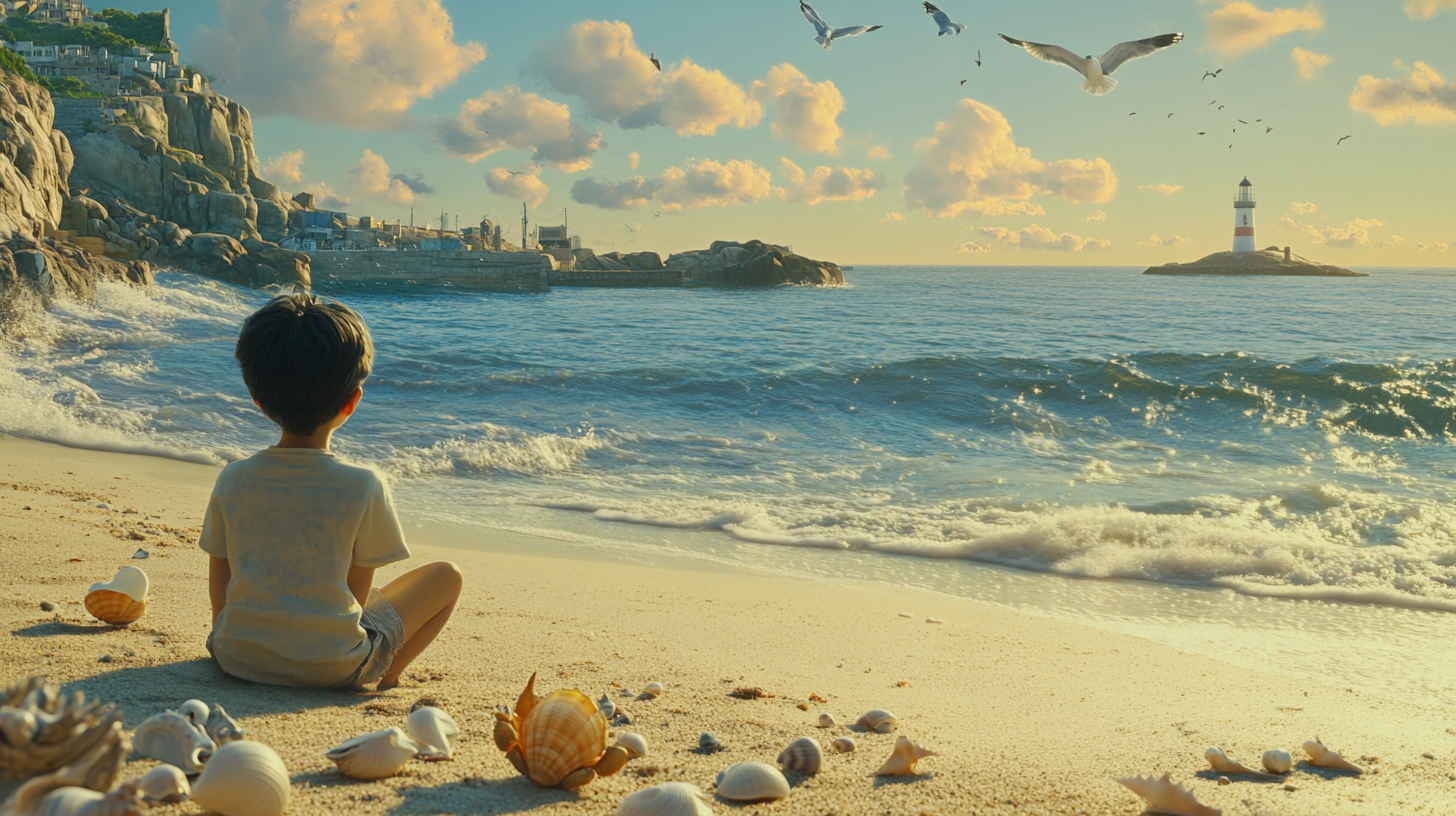한적한 모래사장에 파도가 치고 모래 위에는 조개껍질이 있고 게가 다니고 바다위에는 갈매기가 날아 다니는 오후 늦은 햇살이 바다 위를 비추는 사진, 먼 바다에는 등대도 있어요. 먼 바다를 바라보고 한가롭게 앉아 있는 어린 남자아이가 있는 사진 어린 남자 아이는 가만히 있는 동영상