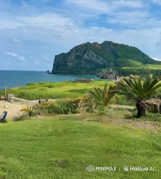 푸른 바다와 하늘이 맞닿은 제주도의 해변에서, 백인 외국인이 여유롭게 산책하는 장면을 담는다. 카메라는 해변의 모래사장을 따라 부드럽게 이동하며, 외국인이 바다를 바라보며 미소 짓는 모습을 포착한다. 배경에는 파란색과 하얀색의 조화로운 풍경이 펼쳐져 있으며, 멀리서 파도가 부서지는 소리가 들린다. 조명은 따뜻한 햇살이 비치는 오후의 분위기로, 자연광이 인물의 얼굴을 부드럽게 비춘다. 외국인은 편안한 여름 복장을 하고 있으며, 바람에 날리는 머리카락이 자유로운 느낌을 더한다. 카메라는 클로즈업으로 외국인의 표정을 잡았다가, 다시 넓은 샷으로 제주도의 아름다운 풍경을 보여주며, 그가 바다를 향해 손을 흔드는 모습으로 전환된다. 주변에는 제주도 특유의 푸른 나무와 바위들이 자리잡고 있으며, 멀리 보이는 해안선은 이국적인 느낌을 더해준다. 전체적인 분위기는 평화롭고 즐거운 여행의 감정을 전달하며, 감상자가 제주도의 아름다움과 함께 외국인의 행복한 순간을 함께 느낄 수 있도록 한다.