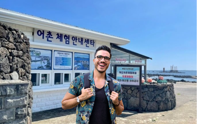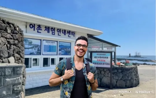 해안가의 어촌체험마을에서 외국인 관광객들이 즐거운 시간을 보내고 있는 장면을 담고 있습니다. 배경은 푸른 바다와 하얀 모래사장이 펼쳐져 있으며, 주변에는 전통적인 어선과 수산물 판매대가 있습니다. 해안가의 나무로 만들어진 작은 정자가 보이고, 그 주변에는 파라솔과 의자들이 놓여 있어 관광객들이 앉아 쉴 수 있는 공간이 마련되어 있습니다. 조명은 따뜻한 햇살이 내리쬐고 있어, 자연스럽고 밝은 분위기를 연출합니다. 바람에 흔들리는 파라솔과 나무가 여유로운 느낌을 더해 줍니다. 카메라는 넓은 앵글로 시작하여, 해변과 마을의 전체적인 풍경을 보여줍니다. 이후 카메라가 천천히 줌인하여 외국인 관광객들이 어촌체험을 즐기고 있는 모습을 클로즈업합니다. 관광객들은 한국 전통 요리를 체험하거나, 해산물을 직접 잡아보는 활동에 참여하고 있으며, 웃음과 대화 소리가 가득합니다. 카메라는 이들의 표정과 활동을 담아내며, 바다의 파도 소리와 함께 조화롭게 어우러집니다. 마지막으로 카메라는 부드럽게 물러나며, 다시 해안가의 전경을 포착하여 장면을 마무리합니다.
