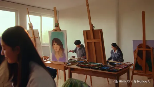 짧은 동영상 장면: 미술 학원 내부 영상 시작은 부드러운 팬 샷으로 미술 학원의 밝고 아늑한 내부를 보여준다. 벽면에는 다양한 학생들의 작품들이 걸려 있고, 자연광이 큰 창문을 통해 들어와 공간을 환하게 비춘다. 바닥은 나무 재질로 따뜻한 느낌을 주며, 여러 개의 미술 용품이 정돈되어 있는 작업대가 보인다. 중앙에는 한국인 학생들이 열정적으로 그림을 그리고 있는 모습이 담긴다. 한 학생은 수채화로 풍경화를 그리며, 다른 학생은 유화로 초상화를 그리는 모습이 보인다. 그들의 표정은 집중과 창의력으로 가득 차 있다. 조명은 자연광과 부드러운 인공 조명이 조화를 이루어 따뜻하고 창의적인 분위기를 만들어낸다. 카메라는 중간 거리에서 학생들을 클로즈업으로 비추며, 그들의 손놀림과 작품에 대한 집중을 강조한다. 카메라가 학생들의 작품을 향해 살짝 줌 인하며, 각기 다른 색감의 물감이 섞이는 모습이 보여진다. 영상의 마지막 부분은 학생들이 서로의 작품을 감상하며 미소를 짓는 장면으로 전환된다. 이때 카메라는 부드럽게 뒤로 물러나며 학원의 전경을 다시 보여주고, 학생들의 창의적인 에너지를 강조하며 영상이 마무리된다.