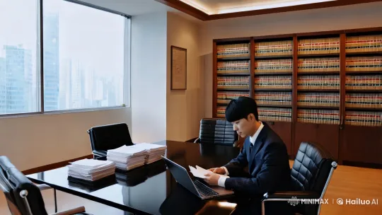 짧은 동영상 장면: 법무법인의 사무실 내부 배경 및 주변 환경: 넓고 현대적인 법무법인 사무실, 벽면은 깔끔한 화이트 톤으로 마감되어 있으며, 한쪽에는 큰 유리창이 있어 자연광이 들어온다. 유리창 너머로는 도심의 고층 빌딩들이 보인다. 사무실 중앙에는 검은색 직사각형 테이블이 놓여 있고, 그 주위에는 고급스러운 의자들이 배치되어 있다. 테이블 위에는 서류 더미와 노트북이 정돈되어 있으며, 한쪽에는 법률 서적이 꽂혀 있는 책장이 있다. 조명 및 분위기: 자연광과 함께 따뜻한 톤의 인공 조명이 조화를 이루어 아늑하고 전문적인 분위기를 만들어낸다. 조명이 부드럽게 비추어져 있어 편안한 느낌을 주며, 사무실 전체가 밝고 활기찬 인상을 준다. 카메라 샷 및 움직임: 카메라는 처음에 사무실 전체를 보여주는 와이드 샷으로 시작하여, 천천히 테이블 쪽으로 줌 인한다. 그 과정에서 사무실의 세련된 인테리어와 정돈된 분위기를 강조한다. 이후, 한 명의 한국인 변호사가 서류를 검토하며 진지한 표정으로 노트북 화면을 바라보는 클로즈업 샷으로 전환된다. 변호사의 손가락이 서류를 넘기는 모습과 함께, 배경에서 동료들이 논의하는 소리가 희미하게 들려온다. 마지막으로 카메라는 변호사의 얼굴을 클로즈업하며, 결단력 있는 표정을 강조한 뒤 장면이 종료된다.