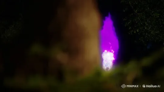 어두운 밤하늘을 배경으로, 중앙에 큰 바이올렛 불꽃이 타오르고 있다. 조명은 불꽃에서 나오는 빛으로, 주변을 부드럽게 비추며 따뜻한 느낌을 준다. 불꽃의 반사광이 나무의 표면에 비치면서, 마치 꿈속의 풍경처럼 몽환적인 분위기를 연출한다. 카메라는 불꽃을 중심으로 천천히 줌인하며, 불꽃의 세세한 움직임과 색깔 변화를 강조한다. 카메라의 움직임은 부드럽고 유려하여, 시청자가 불꽃의 매력에 빠져들게 한다. 이 장면은 신비롭고 매혹적인 분위기를 전달하며, 관객에게 강렬한 인상을 남긴다.