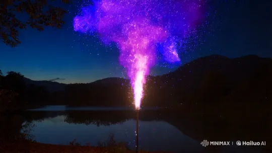 어두운 밤하늘을 배경으로, 중앙에 위치한 거대한 바이올렛 불꽃이 하늘로 솟구쳐 오르는 장면을 담는다. 불꽃은 부드러운 파란색과 보라색의 혼합으로, 마치 춤추듯이 움직이며 주변을 환하게 비춘다. 불꽃의 주변에는 고요한 호수가 있으며, 호수의 표면은 불꽃의 반사로 인해 신비로운 빛을 발산한다. 카메라는 저조도에서 시작하여 천천히 불꽃 쪽으로 줌 인하며, 불꽃의 세부적인 움직임을 포착한다. 카메라의 움직임은 부드럽고 유려하게, 마치 불꽃의 리듬에 맞춰 조정된다. 조명은 불꽃에서 나오는 자연적인 빛으로, 주변 환경을 은은하게 비추며 몽환적인 분위기를 연출한다. 배경에는 흐릿한 산의 윤곽은 없다. 산 위로는 별들이 반짝이고 있다. 바람에 흔들리는 나뭇잎 소리가 들리며, 전체적인 분위기는 신비롭고 평화로운 느낌을 준다. 불꽃의 색깔과 조명이 만들어내는 대비가 강렬하게 느껴지며, 이 모든 요소들이 조화를 이루어 한 폭의 그림 같은 장면을 만들어낸다.
