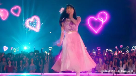 "A cheerful and adorable teenage K-pop idol performing on a vibrant stage. She is wearing a pastel pink and white outfit with a pleated skirt and a sparkling top, perfectly suited for her cute and bubbly personality. As she dances energetically, her movements are full of charm and grace. Neon pink and blue spotlights illuminate the stage, with animated hearts and sparkles floating around her. The crowd cheers enthusiastically, waving glow sticks in rhythm to the upbeat music."