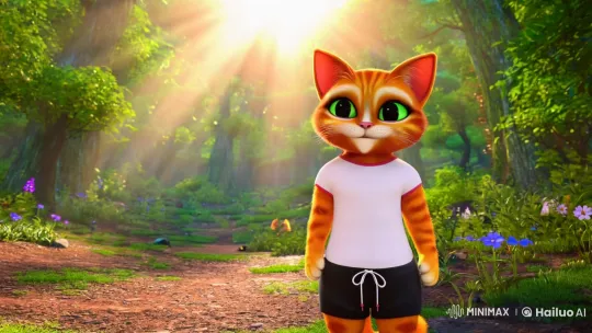 짧은 동영상 장면: 한 마리 귀여운 주황색 얼룩 고양이가 자신감 있게 마법 같은 숲 속에 서 있는 모습. 고양이는 중간 크기의 표현력 있는 눈을 가지고 있으며, 부드러운 주황색 털에 얼굴 부분은 흰색 하이라이트가 돋보인다. 고양이는 간단한 흰색 티셔츠와 끈이 있는 검은색 반바지를 입고 있다. 배경: 풍성하고 햇살이 가득한 숲 속. 나무 사이로 부드러운 햇살이 비추며, 생동감 넘치는 초록색 잎과 여기저기 흩어져 있는 야생화들이 장관을 이루고 있다. 숲의 깊은 곳에서는 작은 새들이 지저귀는 소리가 들리고, 바람에 나뭇잎이 살랑거리는 소리가 배경을 더욱 풍성하게 만든다. 조명과 분위기: 따뜻하고 아늑한 분위기로, 햇살이 고양이의 털에 반사되어 부드러운 금빛으로 빛난다. 전체적인 조명은 자연광으로, 고양이와 주변 환경을 부드럽게 감싸 안고 있다. 카메라 샷의 종류와 움직임: 카메라는 고양이를 중심으로 한 중간 샷에서 시작하여, 고양이의 표정을 강조하기 위해 서서히 클로즈업으로 이동한다. 고양이의 눈빛과 미소가 잘 드러나도록 카메라가 약간 아래에서 위로 향하며, 고양이의 자신감 있는 자세를 강조한다. 마지막에는 고양이가 주위를 둘러보는 모습으로 카메라가 천천히 회전하며 숲의 아름다움을 포착한다.