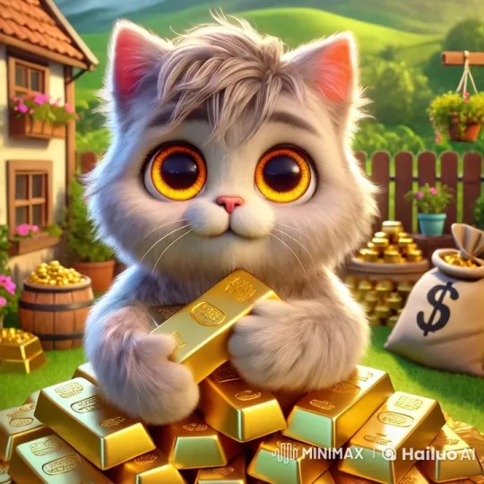 금이 많은 마당에서 한복을 입고 있는 귀여운 고양이가 금덩어리를 앞으로 건네주는 장면.