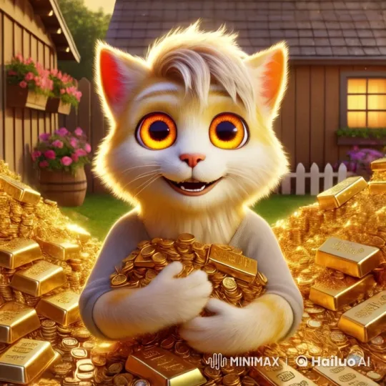 많은 금덩어리 직접 건네주는 모습.마당에는 넘쳐나는 금. 집은 궁전.얼굴은 기쁨이 가득차고 귀엽고 부드럽다.