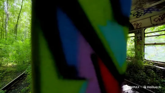 푸르른 숲속에 위치한 폐지하철의 내부를 배경으로 한 짧은 동영상 장면. 햇살이 나뭇잎 사이로 스며들며 부드러운 조명을 만들어내고, 주변에는 다양한 식물들이 자생적으로 자라고 있다. 폐지하철의 창문은 깨져 있지만, 그 틈새로 들어오는 빛이 바닥에 아름다운 패턴을 만들어낸다. 카메라는 천천히 폐지하철의 내부를 따라 움직이며, 벽면에 그려진 화려한 그래피티와 식물들이 얽혀 있는 모습을 포착한다. 카메라 앵글은 낮은 위치에서 시작해 점차 높아지며, 전체적인 풍경을 보여준다. 주변의 소리는 바람이 나뭇잎을 스치는 소리와 함께 새들의 지저귐이 섞여 있어, 평화롭고 아늑한 분위기를 자아낸다. 동영상은 5초에서 10초 사이의 길이이다.