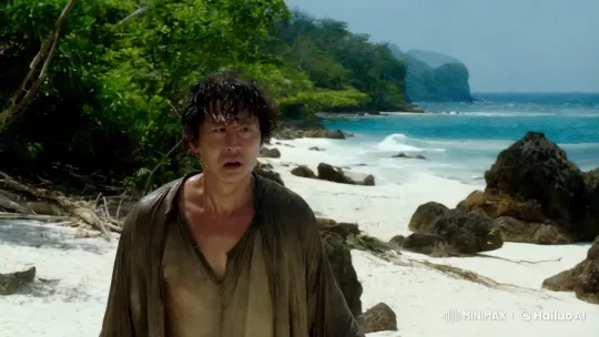 짙은 푸른 바다와 하얀 모래사장이 펼쳐진 무인도의 풍경. 화면 중앙에는 한국인 남자가 서 있다. 그는 혼란스러운 표정으로 주변을 둘러보며, 긴장한 듯한 모습이다. 그의 머리카락은 바람에 날리며, 옷은 젖어 있다. 카메라는 남자의 얼굴을 클로즈업하며, 그의 눈빛에 긴장감과 두려움이 담겨 있는 것을 강조한다. 이후 카메라는 남자의 시선을 따라 이동하며, 주변의 울창한 열대 식물과 바위, 그리고 멀리 보이는 파도가 부딪히는 장면을 포착한다. 조명은 자연광으로, 태양이 높이 떠 있어 강렬한 햇빛이 남자의 얼굴에 비치고, 그로 인해 땀방울이 맺혀 있는 모습이 보인다. 배경에서는 파도 소리와 바람 소리가 들려와 긴박한 분위기를 더한다. 마지막으로, 카메라는 남자가 혼란스러운 표정으로 바다를 바라보는 장면에서 서서히 줌 아웃하며, 그의 외로움과 고립감을 강조하는 방식으로 마무리된다.