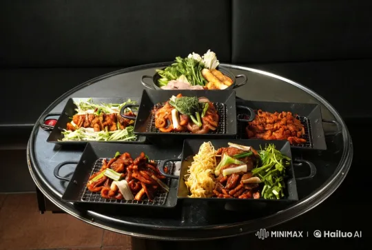 짧은 동영상 장면: 대한민국의 유명인 A가 직화설 음식을 먹고 있는 장면을 담습니다. 배경은 서울의 한 현대적인 레스토랑으로, 벽면은 나무와 유리로 구성되어 있으며, 아늑한 분위기를 자아냅니다. 테이블에는 다양한 직화설 음식들이 아름답게 플레이팅되어 있고, 주변에는 다른 손님들이 대화를 나누며 즐거운 시간을 보내고 있습니다. 조명은 부드러운 따뜻한 색감으로, 테이블 위에는 촛불이 켜져 있어 아늑한 분위기를 더합니다. 카메라는 A의 얼굴을 클로즈업으로 촬영하며, 그가 음식을 한 입 먹고 맛있다는 표정을 지을 때, 천천히 팬 아웃하여 테이블에 놓인 다양한 요리들을 보여줍니다. 카메라 움직임은 부드럽고 자연스럽게, A의 표정과 음식의 디테일을 강조합니다. 마지막에는 A가 음식을 맛있게 먹고 나서 미소를 지으며 "정말 맛있어요!"라고 말하는 장면으로 마무리됩니다.
