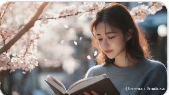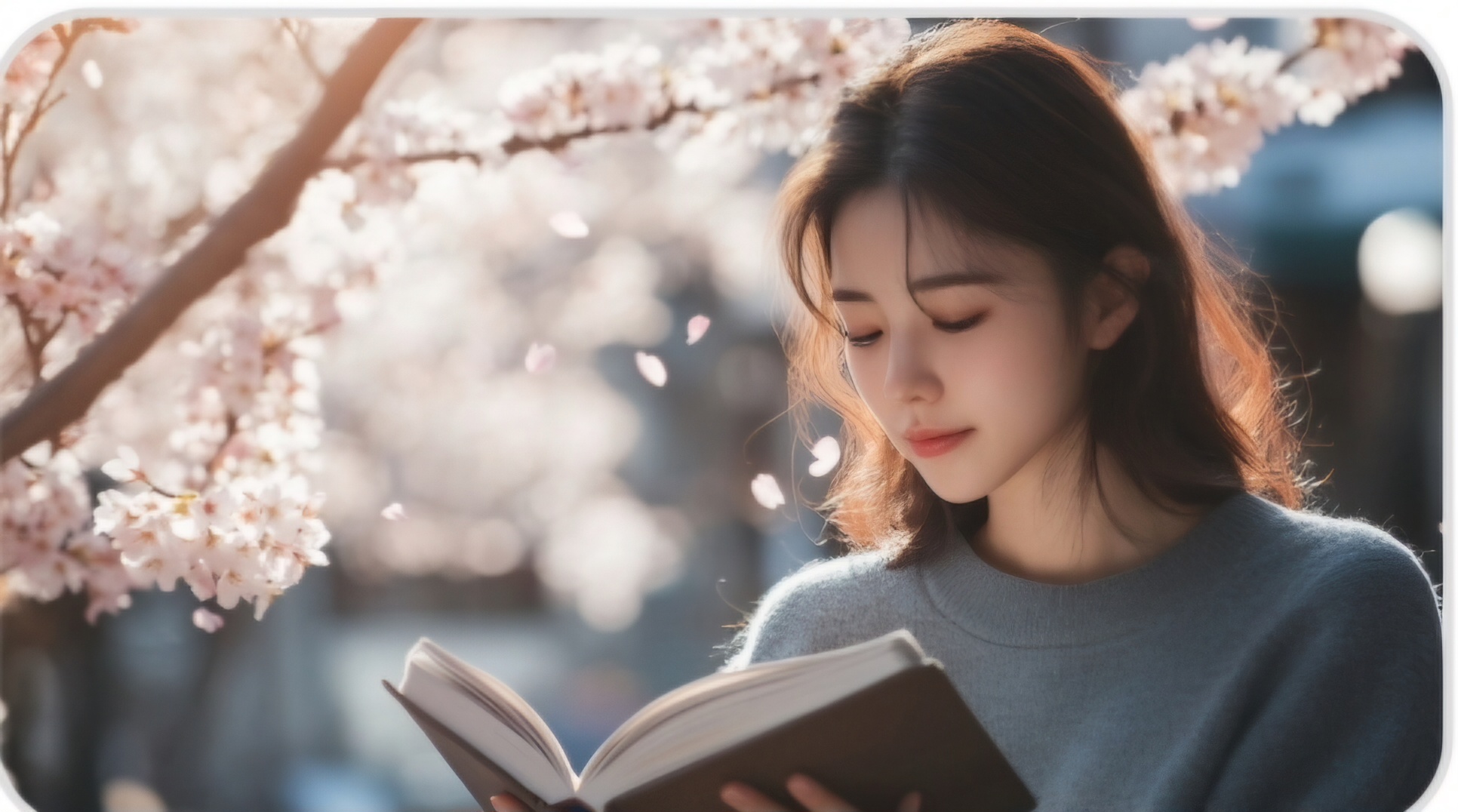 20대 한국인 여성 인플루언서가 벚꽃이 흩날리는 아름다운 공원 풍경을 배경으로 카페의 테라스에 앉아 있다. 그녀는 긴 머리를 자연스럽게 늘어뜨리고, 화사한 봄옷을 입고 있다. 테이블 위에는 따뜻한 커피 한 잔과 그녀가 읽고 있는 책이 놓여 있다. 주변에는 벚꽃 나무가 만개해 있어 분홍색 꽃잎들이 바람에 날리며, 부드럽고 아늑한 분위기를 연출한다. 햇살은 따뜻하게 비추고, 부드러운 자연광이 그녀의 얼굴을 환하게 밝혀준다. 카메라는 고정되어 있으며, 인플루언서의 상반신을 중심으로 촬영되지만 전체적인 배경도 충분히 느낄 수 있다. 그녀는 책을 읽으며 가끔 커피를 한 모금 마시는 여유로운 모습을 보인다. 전체적인 색감은 분홍색과 따뜻한 톤으로 조화롭게 어우러져, 평화롭고 차분한 분위기를 자아낸다. 벚꽃이 바람에 흩날리는 모습이 배경에서 부드럽게 흐르며, 영상의 전체적인 느낌을 더욱 포근하게 만든다.