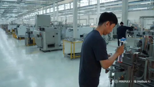 넓은 공장 내부, 깨끗하게 정돈된 작업 공간이 보인다. 바닥은 광택이 나며, 주변에는 대형 기계와 설비가 배치되어 있다. 카메라는 전경을 담기 위해 넓은 앵글로 시작하며, 천장 조명은 밝고 차가운 백색광으로, 깨끗한 분위기를 연출한다. 장면이 시작되면, 한 한국인 남성이 청소 장비를 조작하며 기계의 구석구석을 세심하게 청소하는 모습이 담긴다. 카메라는 남성을 따라가며 다양한 각도에서 촬영된다. 남성의 손길이 닿는 곳마다 먼지가 사라지는 모습이 클로즈업으로 비춰지며, 청소가 진행되는 동안 기계의 소음이 배경으로 들린다. 배경에는 다른 작업자들이 바쁘게 움직이는 모습이 보이며, 그들은 각자의 업무에 집중하고 있다. 카메라는 천천히 줌 아웃하며 전체 공장의 모습을 보여주고, 청소가 이루어지는 공간이 얼마나 넓은지를 강조한다. 마지막으로, 카메라는 다시 남성의 얼굴을 클로즈업하며, 만족스러운 미소를 짓는 장면으로 마무리된다.