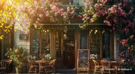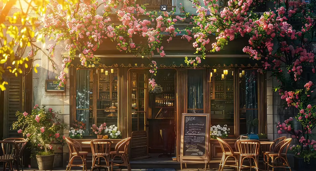 햇살이 내리쬐는 유럽의 한적한 커피샵 , 봄의 따뜻한 날씨가 느껴진다. 커피샵 지붕위로 만개한 꽃들이 보이고, 바람에 살랑이는 나뭇잎 소리가 들린다. 카메라는 고정되어 있고, 잔잔하게 꽃잎들이 떨어진다