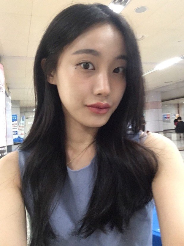 한 여성이 지하철 안에서 셀카를 찍고 있는 장면을 상상해보세요. 20대 초반의 한국인 여성으로, 긴 머리를 자연스럽게 풀어헤치고 있습니다. 그녀는 편안한 분위기의 여름 옷를 입고 있으며, 이쁜 미소를 지으면서 셀카 포즈를 취하고 있습니다.