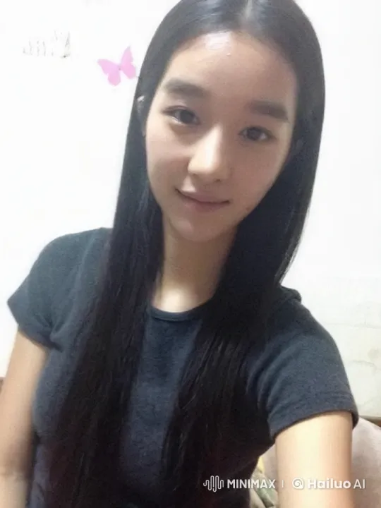 아늑한 방 안에서 나시티를 입고 셀카를 찍고 있는 한국인 여자친구의 모습. 그녀는 웃는 미소를 지으며 브이하면서 카메라를 바라보고 있다.