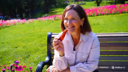 한 여성이 햇살이 잘 드는 공원 벤치에 앉아 소고기칩을 즐기고 있는 장면. 그녀는 편안한 캐주얼 복장을 하고 있으며, 밝은 미소를 지으며 소고기칩을 한 손에 들고 있습니다. 주변에는 푸른 잔디와 화려한 꽃들이 만발해 있어 화사한 분위기를 자아냅니다. 조명은 부드러운 자연광으로, 햇살이 그녀의 얼굴을 따뜻하게 비추고 있어 행복한 표정을 더욱 강조합니다. 카메라는 그녀의 얼굴을 클로즈업하며, 소고기칩을 입에 넣는 순간을 포착합니다. 이후 카메라가 살짝 뒤로 물러나면서 그녀의 전체적인 모습과 주변 환경을 보여주며, 행복한 순간을 강조합니다. 배경에는 다른 사람들이 여유롭게 산책하거나 대화를 나누는 모습이 보이며, 전체적으로 편안하고 즐거운 분위기를 연출합니다.