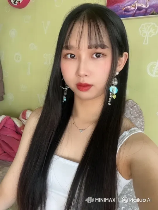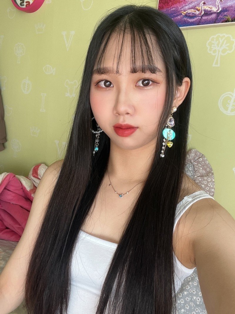 한국인 20대 여성이 하얀색 나시티랑 청바지를 입은 채 무표정으로 카메라를 바라보고, 눈을 감으면서 길게 방언기도를 하면서 셀카를 찍고 있다.