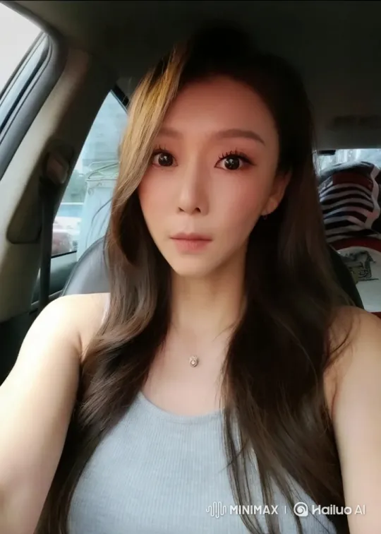 자동차 안에서 한국인 20대 여성이 하얀색 나시티를 입은 채 무표정으로 카메라를 바라보고, 눈을 감으면서 간절하게 방언기도를 하면서 셀카를 찍고 있다.