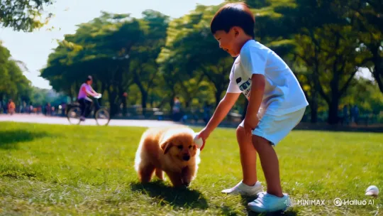 짧은 동영상 장면: 한적한 공원에서 강아지가 뛰어노는 모습 장면 설명: 초여름의 맑은 날, 푸른 잔디가 깔린 공원에서 한국인 소년이 강아지와 함께 놀고 있다. 강아지는 작은 골든 리트리버로, 금빛 털이 햇빛에 반짝인다. 소년은 흰색 티셔츠와 반바지를 입고 있으며, 강아지에게 공을 던져주고 있다. 강아지는 신나게 공을 쫓아가고, 그 모습을 소년이 웃으며 바라본다. 배경과 주변 환경: 공원의 배경에는 푸른 나무들이 우거져 있고, 그 사이로 사람들이 산책하거나 자전거를 타는 모습이 보인다. 멀리에는 어린아이들이 그네를 타고 있는 모습도 보인다. 하늘은 맑고 파란색으로 구름 한 점 없이 깨끗하다. 조명과 분위기: 따뜻한 햇빛이 공원 전체를 감싸고 있어 아늑하고 밝은 분위기를 연출한다. 강아지의 털이 햇빛에 반사되어 더욱 빛나고, 소년의 얼굴에는 행복한 미소가 가득하다. 카메라 샷의 종류와 움직임: 카메라는 중간 거리에서 소년과 강아지를 잡고 있다. 처음에는 고정 샷으로 소년이 공을 던지는 순간을 포착하고, 강아지가 뛰어가는 모습을 따라가며 팬닝(panning) 샷으로 전환된다. 마지막에는 강아지가 공을 물고 돌아오는 모습을 클로즈업으로 잡아, 귀여운 표정을 강조한다.