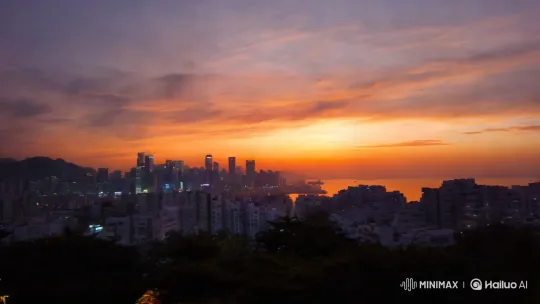 해가 저물어가는 저녁, 도시의 스카이라인이 배경으로 펼쳐진다. 하늘은 주황색과 보라색의 그라데이션으로 물들어가며, 구름이 부드럽게 흘러간다. 카메라는 천천히 하늘을 향해 줌 인하며, 빛나는 태양이 수평선 아래로 사라지는 순간을 포착한다. 도시의 건물들은 점차 어둠 속에서 윤곽을 드러내고, 창문마다 따뜻한 노란빛이 하나둘 켜지기 시작한다. 카메라는 낮은 앵글에서 시작해 점차 상승하며, 도시의 거리와 사람들의 모습을 비춘다. 한국인들이 저녁을 즐기며 걷고 있는 모습이 보인다. 조명은 부드럽고 따뜻한 느낌을 주며, 도시의 분위기는 아늑하고 평화롭다. 마지막으로 카메라는 도시의 전경을 넓게 보여주며, 조명이 켜진 거리와 함께 하루가 저물어가는 모습을 감상하게 한다.