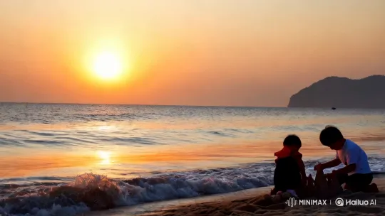 바닷가에서의 일출 장면을 배경으로, 해가 수평선 위로 천천히 떠오르는 모습을 담은 5초 길이의 동영상. 해수면은 부드럽게 반짝이며, 해가 떠오르면서 주황색과 분홍색의 따뜻한 빛이 하늘을 물들인다. 바다의 파도는 잔잔하게 해안에 부딪히며, 해변에는 한국인 가족이 모래성을 쌓고 있는 모습이 보인다. 카메라는 느리게 팬하여 해변의 전체 풍경을 포착하고, 부드러운 조명이 따뜻한 분위기를 연출한다. 이어서, 풍력 발전기가 등장하는 장면으로 전환된다. 카메라는 고정된 샷에서 서서히 줌 아웃하며, 바닷가의 풍경과 함께 멀리 보이는 풍력 발전기들이 돌아가는 모습을 보여준다. 바람에 흔들리는 풀과 함께 바다의 파도 소리가 배경에 깔려, 자연의 조화로운 소리를 강조한다. 서서히 날이 밝아오면서 가시 저녁이 되어 도시전체의 조명이 점점 밝아오는 풍경장면이 배경으로 으로 전환된다. 다시 아침으로 전환하면서 RACOOL 로고가 등장한다