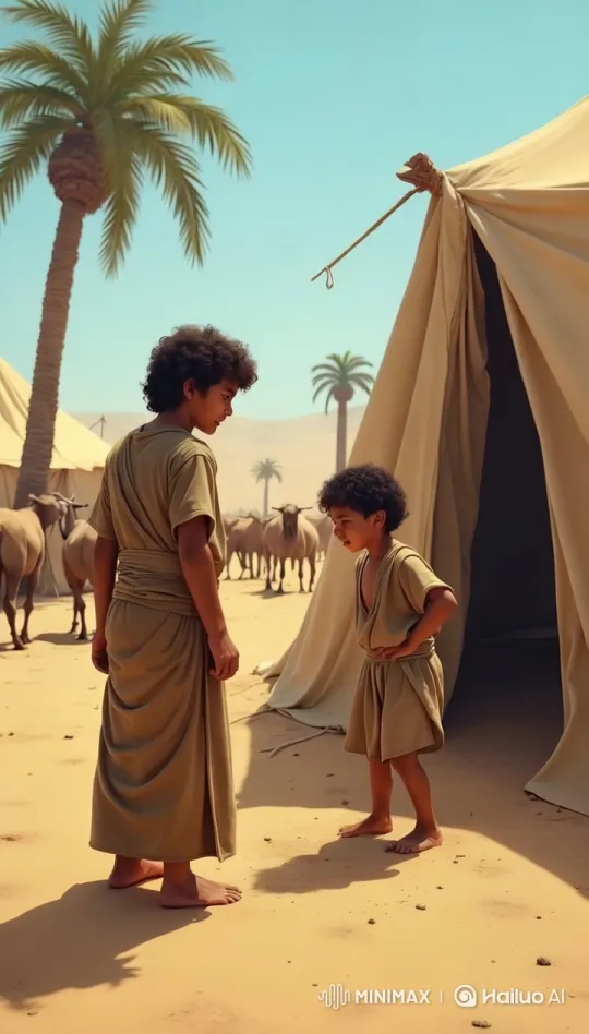 왼쪽 남자 아이가 오른쪽 아이를 향해 소리치는 장면입니다. 오른쪽 아이는 멀뚱멀뚱 바라만 보고 있습니다.
